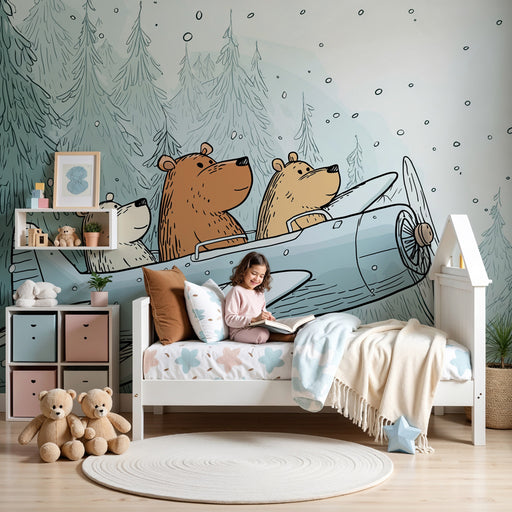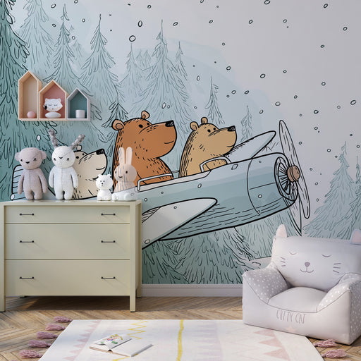 KidsWallNastupte na zimní dobrodružství s tímto papírovým tapetou pro děti, který zobrazuje roztomilé medvědy létající nad zasněženým lesem. Letadlo, na kt...