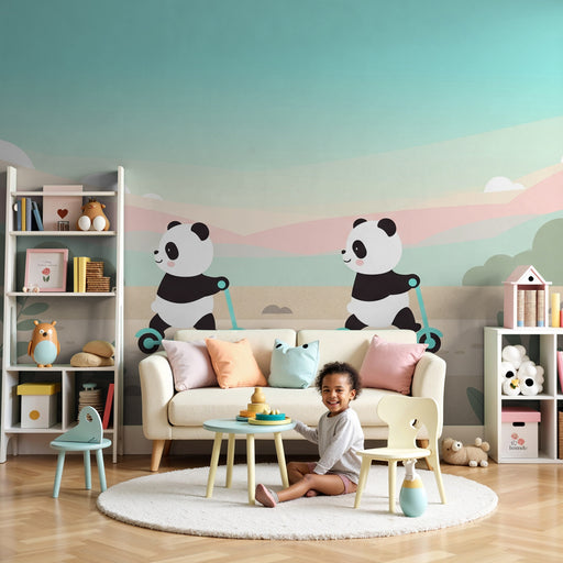 KidsWallPřineste do dětského pokoje radost a dynamiku s tímto papírovým tapetou pro děti, která zobrazuje roztomilé pandy, kteří si hrají na svých koloběžk...