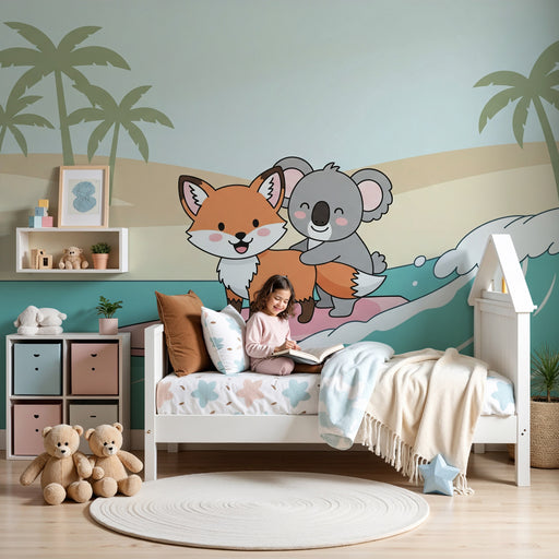 KidsWallPonořte své dítě do hravého a veselého světa s tímto papírovým tapetou pro děti, který zobrazuje úsměvného lišáka a roztomilého koalu na barevném s...