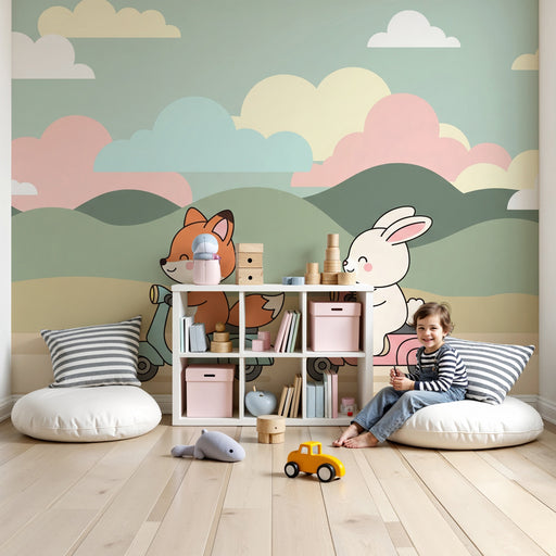 KidsWallNastupte na dynamické dobrodružství s tímto tapetou pro děti, která zobrazuje zábavného lišáka a zajíce, kteří jezdí na svých skútrech. V klidném k...
