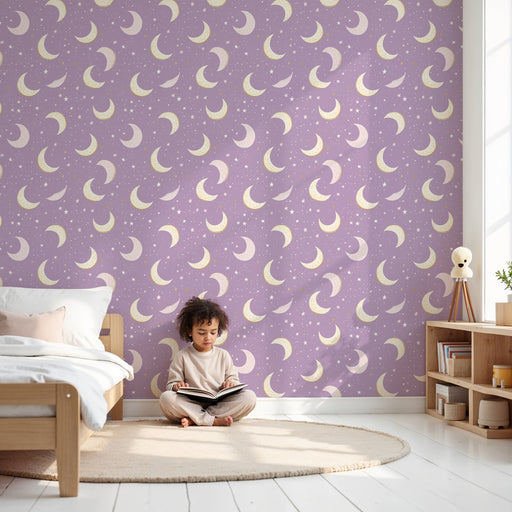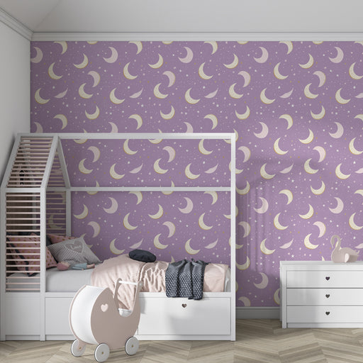 Dětská tapeta s motivy | Stěny s hvězdami a jemnými měsíci na fialovém pozadí