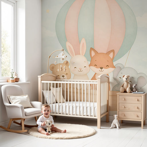 Zobrazit celý detailKinderzimmer Tapete | Niedliche Tiere in einem Heißluftballon