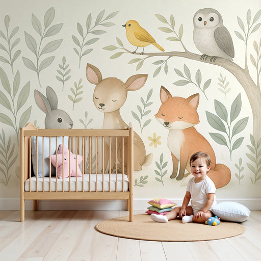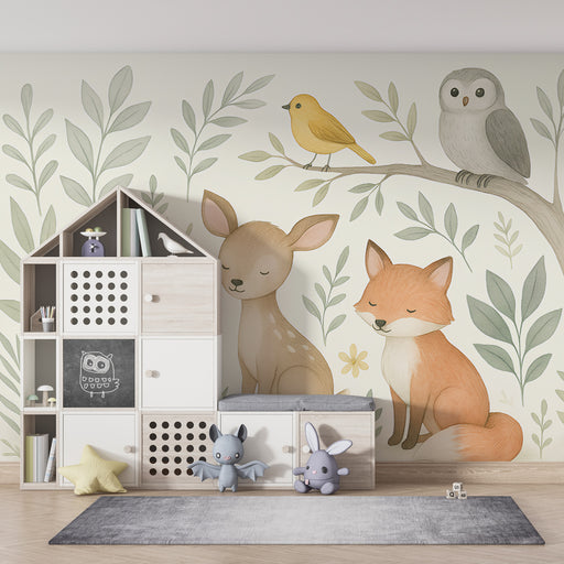 KidsWallPřineste do dětského pokoje něhu a přírodu s tímto tapetou pro děti, která zobrazuje roztomilá zvířata z lesa. Šibalí lišák, usmívající se srnčí ml...