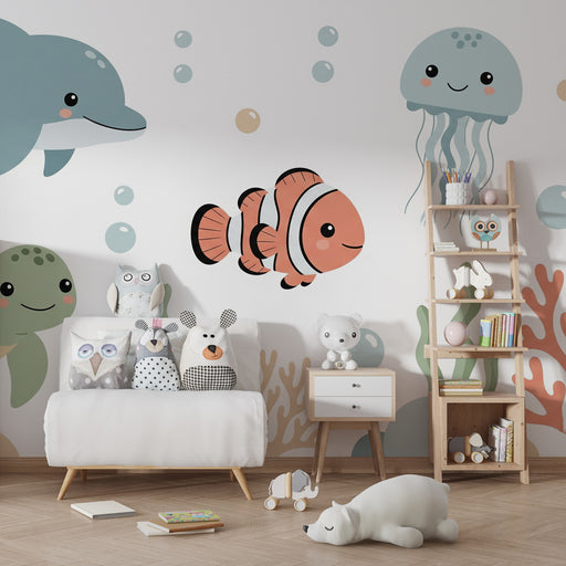 KidsWallPonořte se do kouzelného mořského světa s tímto tapetou pro děti, která zobrazuje roztomilého delfína, elegantní želvu a barevného klauna, vše v u...