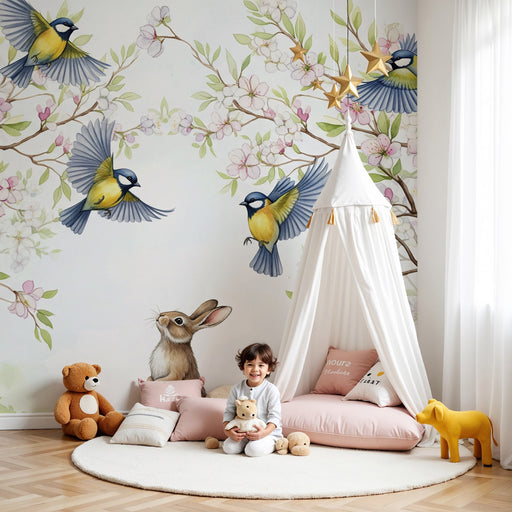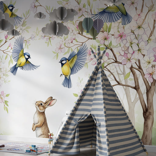 Zobrazit celý detailTapeta do dětského pokoje | Zvědavý králík pod kvetoucími ptáky