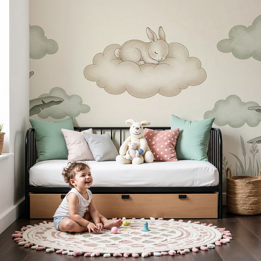 KidsWallPonořte se do světa jemnosti a snů s tímto papírovým tapetem do dětského pokoje, který zobrazuje roztomilého zajíce, který se schoulil na měkkém ob...