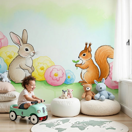KidsWallProměňte pokoj vašeho malého s tímto tapetou pro dětský pokoj s kouzelným motivem roztomilého králíka a šibalčivé veverky obklopené jasnými květina...