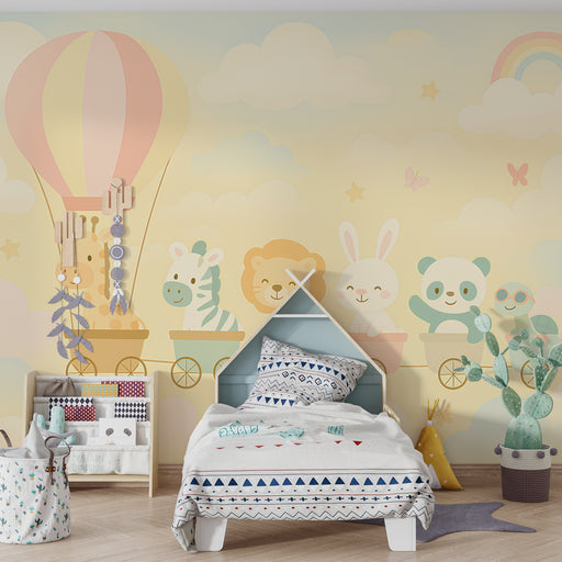 KidsWallNastupte na barevné dobrodružství v dětském pokoji s tímto papírovým tapetou pro děti, které zobrazuje roztomilý vlak tažený velkými huňatými zvířa...