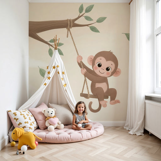 KidsWallProměňte pokoj vašeho miminka v kouzelný vesmír s tímto papírovým tapetou pro děti. Roztomilý opice se baví na houpačce, visící mezi luxusními list...