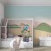 Scéna je obklopena jemnými kopcemi, vytvářející kouzelnou atmosféru, která stimuluje fantazii. Kombinace odstínů zelené, béžové a modré vytváří uklidňující atmosféru, ideální pro podporu odpočinku a kreativity vašeho dítěte.