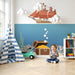 Jemné odstíny modré vytvářejí uklidňující a poutavou atmosféru, která je ideální pro podněcování fantazie vašeho dítěte. Bubliny vzduchu, které unikají z truhly, dodávají dotek kouzla a proměňují pokoj v opravdový svatyni námořního průzkumu.