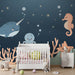 ponořte se do kouzelné vodní země s tímto tapetou pro děti, která zobrazuje přátelské mořské tvory. Úsměvný narval, roztomilá chobotnice a veselý mořský koník plavou mezi stylizovanými korály a hvězdami mořskými, vytvářejíce hravou a barevnou atmosféru, která probudí fantazii vašeho malého dobrodruha.