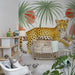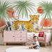 Ponořte se do fascinujícího světa džungle s tímto papírovým tapetem do dětského pokoje, který zobrazuje majestátního leoparda. Ležící na větvi, tento elegantní šelma přitahuje pozornost svým skvrnitým kožichem a pronikavým pohledem. Tropické pozadí zdobené bujnými palmami a květinovými motivy vytváří živou a teplou atmosféru.