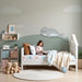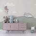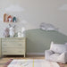 Jemné odstíny zelené a béžové, doplněné jemnými obláčky, přinášejí do prostoru nádech něhy a klidu. Každý prvek je pečlivě vykreslen, aby podpořil fantazii a zároveň vytvořil relaxační prostředí.