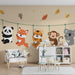 Vyzdobte dětský pokoj tohoto tapetou pro děti, která zobrazuje hravou a barevnou scénu. Pět roztomilých zvířat, včetně pandy, lišky, tygra, opice a koaly, se radostně houpe na provaze, přinášejíce do prostoru špetku radosti a zábavy.