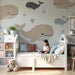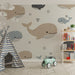 Forvandl dit babys værelse til en fortryllende havverden med denne børneværelse tapet dekoreret med charmerende hvaler. Disse elskelige skabninger, i blide nuancer af beige, blå og grå, svømmer glad blandt glimtende stjerner og hjerter, skaber en legende og beroligende atmosfære.