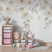 Redesign dit babyværelse til et alt for sødt sted med denne babytapet prydet med smukke, delikate blomster. De bløde nuancer af beige og grå skaber en beroligende stemning, ideel til søvn og dagdrømme. Blomsterne, med deres lette kronblade og elegante blade, tilføjer et strejf af natur og ro til rummet.