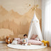 Træsilhuetterne og de rolige bjerge i baggrunden skaber en beroligende atmosfære, der er ideel til fantasi og opdagelse. Denne fordybende dekoration vækker dit barns nysgerrighed og giver dem eventyr i naturens hjerte.