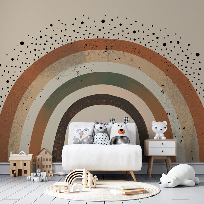 De varme og naturlige nuancer, fra terracotta til blød beige, over nuancer af salviegrøn og dyb brun, giver dette design et harmonisk og tidløst præg. De delikat teksturerede mønstre, prikket med små abstrakte punkter, bringer en subtil balance mellem modernitet og håndværksånd. Denne regnbue, med sine flydende og bløde kurver, passer perfekt ind i et børneværelse og bringer en følelse af ro og velvære.