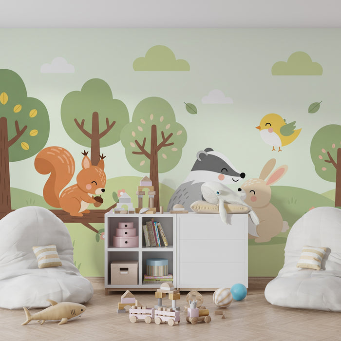 Bring nature's magic into your child's room with this kids room wallpaper depicting a fun scene of forest animals. A cute badger and an adorable rabbit share a moment of camaraderie, while a mischievous squirrel prepares to enjoy a hazelnut and a little bird sings joyfully nearby. This enchanting world stimulates the imagination and encourages a sense of joy and sharing.