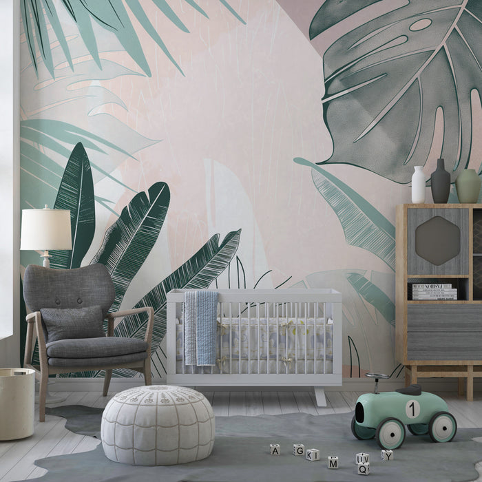 Børneværelse tapet | Pastel tropisk løv og blødhed