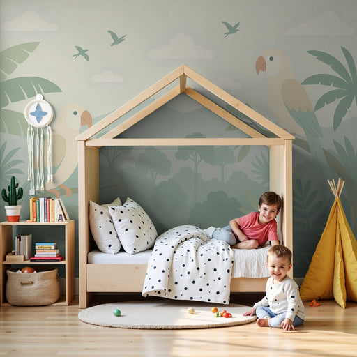 KidsWallTransformér dit barns værelse til et afslappende og inspirerende sted med denne børneværelse tapet, der viser delikate papegøjer over en mystisk ju...