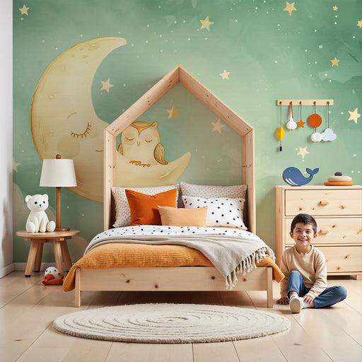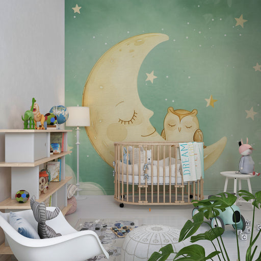KidsWallTransformér dit barns værelse til en oase af fred med vores Børneværelse tapet "Kærlig måne og lille sovende ugle midt i stjernerne". Dette fortryl...