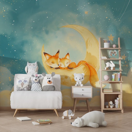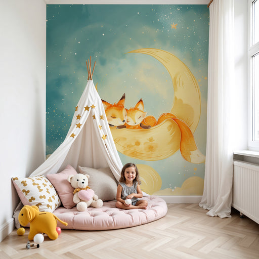 Børneværelse tapet | Sovende ræve på en halvmåne, stjernehimmel og bløde skyer