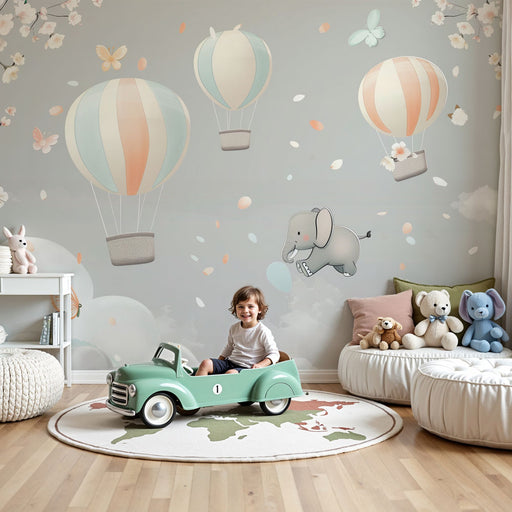 KidsWallDyk ned i en verden, hvor blødhed og lethed mødes, hvor en adorable elefant leger med en bold blandt pastel luftballoner, der flyder i en himmel fy...