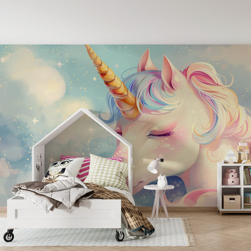 KidsWallTransformér dit barns værelse til en sand fredfyldt oase med vores børneværelse tapet, der viser en sovende enhjørning i en hængekøje af skyer midt...