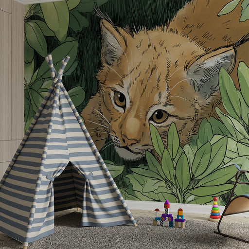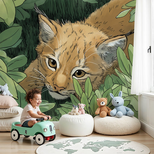 Vis alle detaljerBørneværelse tapet | Ungt gaupe skjult blandt frodige blade
