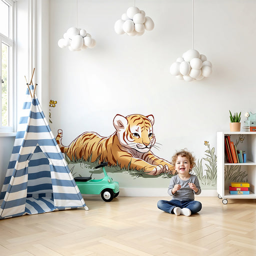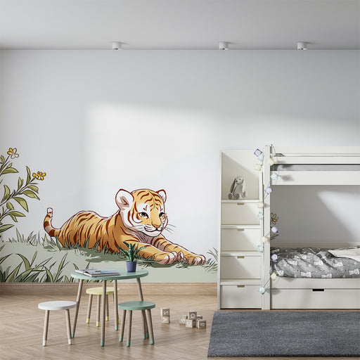 KidsWallTransformér dit barns værelse med denne børneværelse tapet, der viser en ung, drillesyg tiger, der strækker sig fredeligt på en græstæppe. Denne fo...