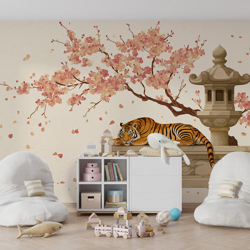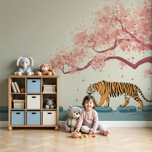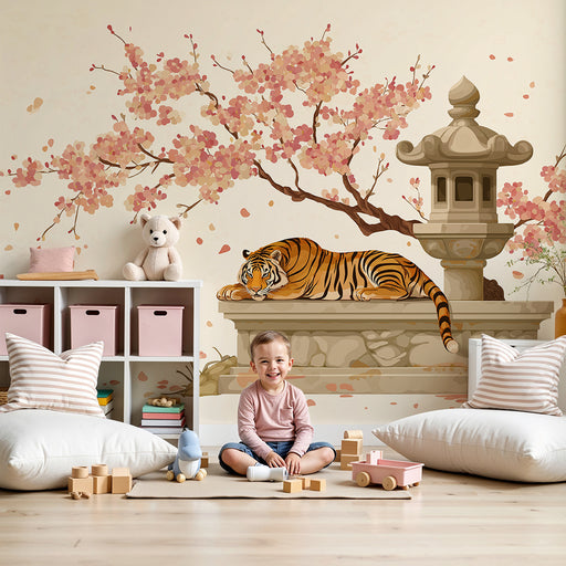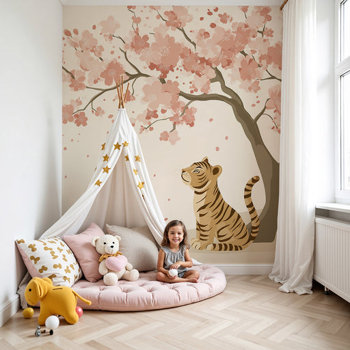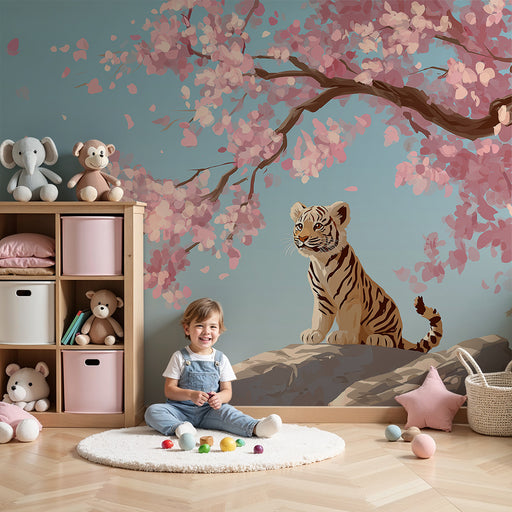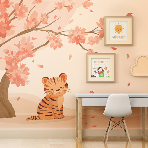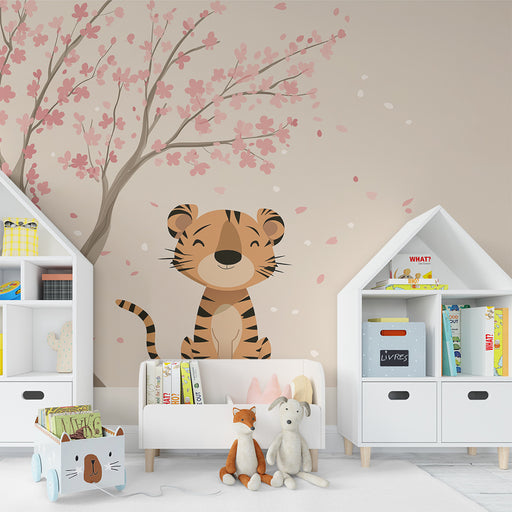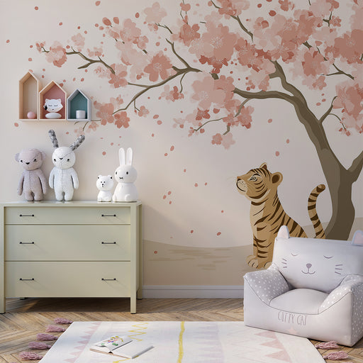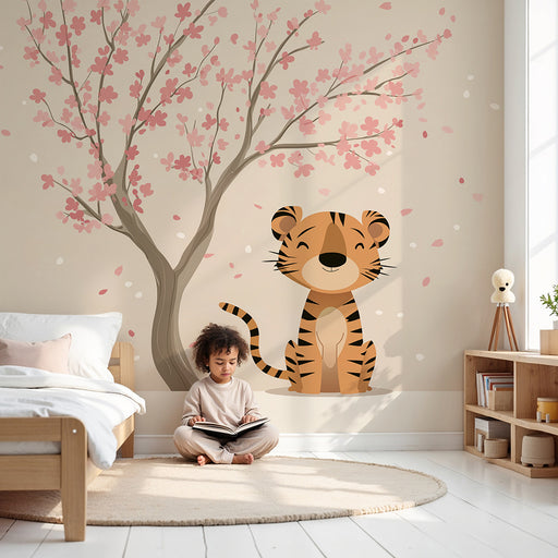 KidsWallForvandl dit barns værelse til et fortryllende rum med denne børneværelse tapet der viser en sød tiger, der sidder under en blomstrende kirsebærtræ...