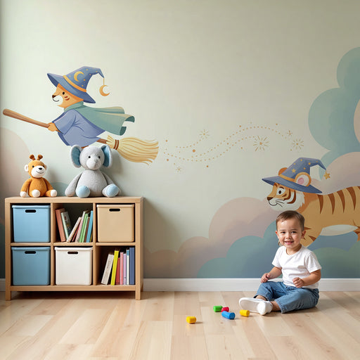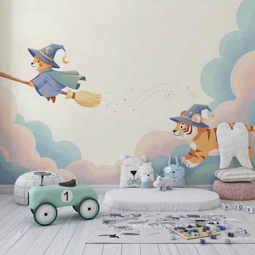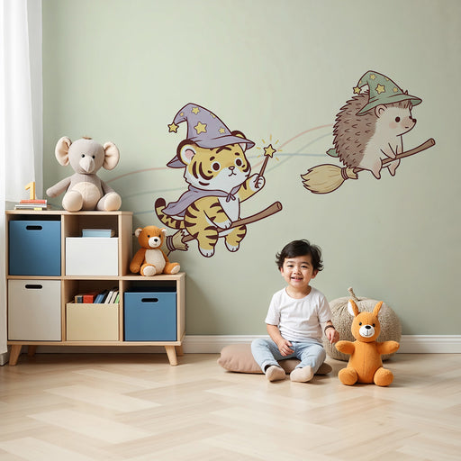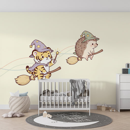 KidsWallTag med på en fortryllende rejse med denne børnetapet, der viser en tiger og en pindsvin, begge iført troldmandshatte, der flyver på deres koste. D...