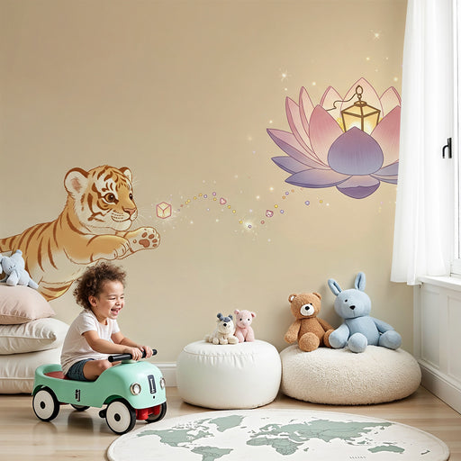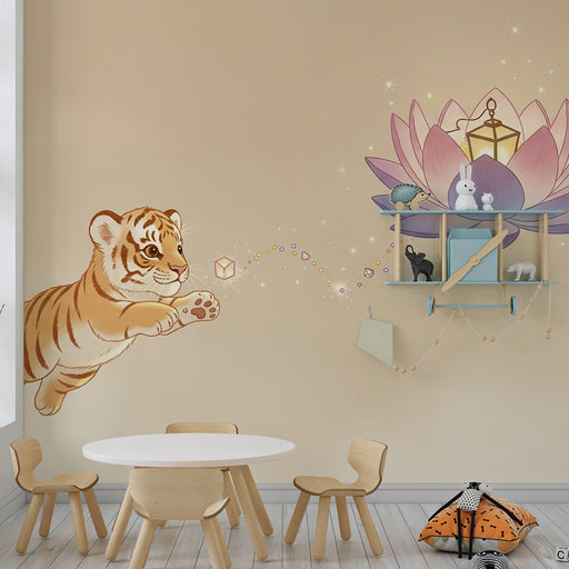 Vis alle detaljerBørneværelse tapet | Lille tiger hopper mod en magisk lotusblomst