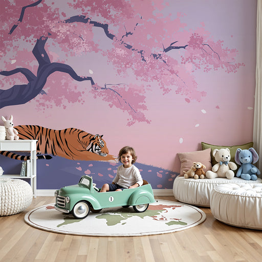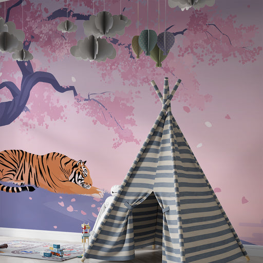 KidsWallTag med på en fortryllende rejse med denne børnetapet, der viser en majestætisk tiger, der hviler under et blomstrende kirsebærtræ. De delikate lys...