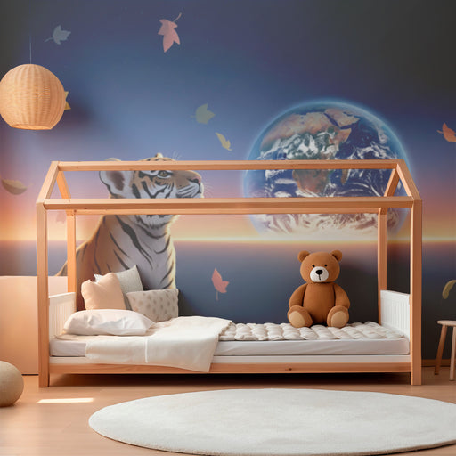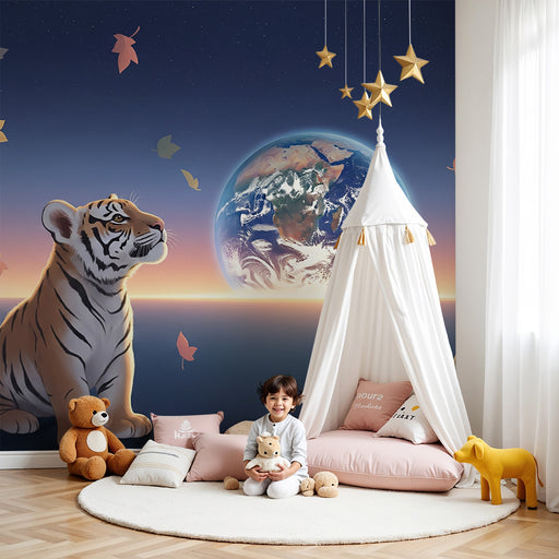 Børneværelse tapet | Betragtende tiger under en stjernehimmel med Jorden i baggrunden