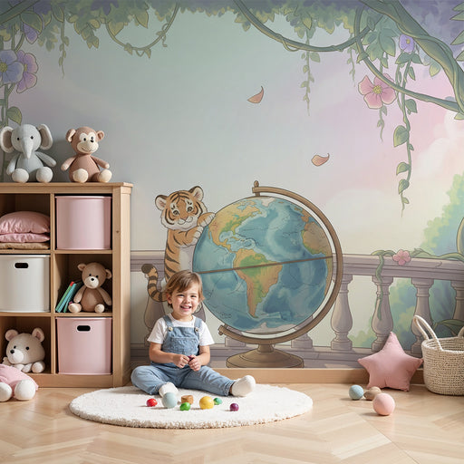 KidsWallTag med på et uddannelsesmæssigt eventyr med denne børnetapet, der viser en sød tiger, der leger med en jordklode. Omgivet af farverige blomster og...