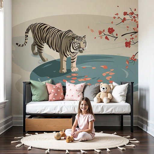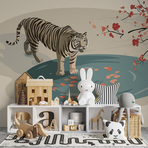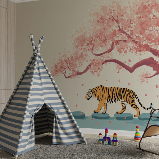 KidsWallForvandl dit barns værelse til et levende maleri med denne børnetapet, der viser en majestætisk tiger, der går på sten under et blomstrende kirsebæ...