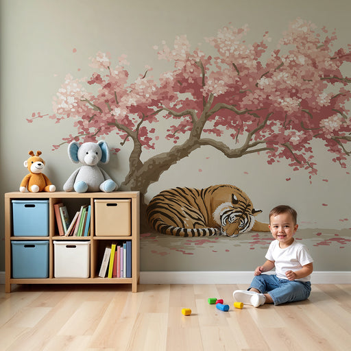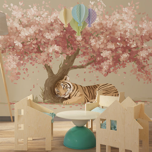 KidsWallTransformér dit barns værelse til et sted med ro med denne børnetapet, der viser en sovende tiger under en smuk blomstrende kirsebærtræ. De delikat...