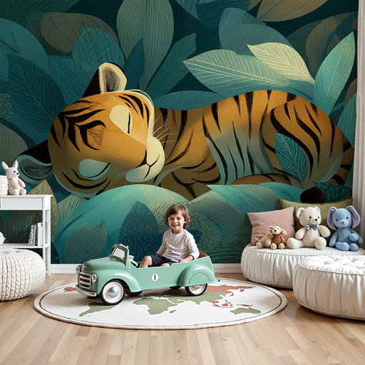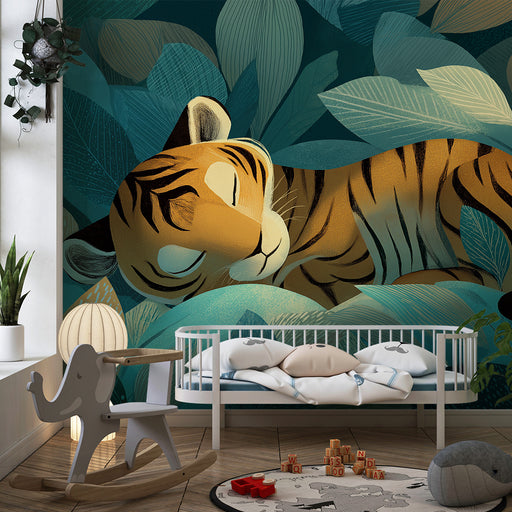 KidsWallDyk ned i en vild og beroligende verden med denne børneværelse tapet der viser en fredeligt sovende tiger omgivet af frodige blade. De turkis og gr...