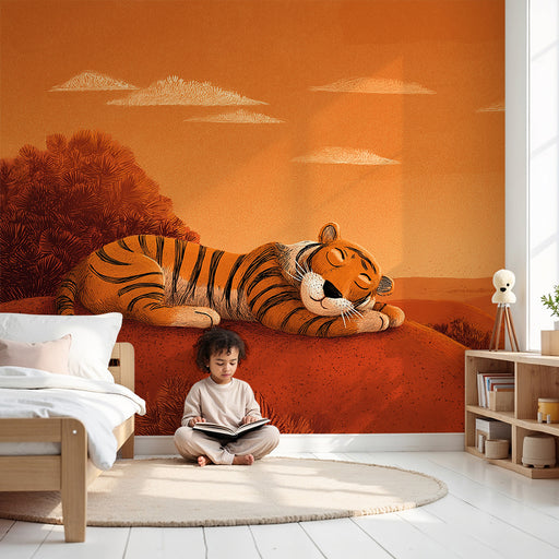 Vis alle detaljerBørneværelse tapet | Søvnig tiger under en orange himmel