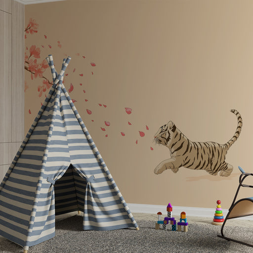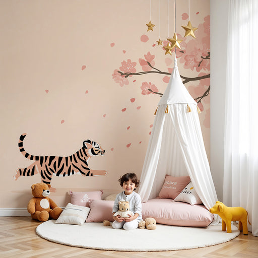 KidsWallBring en magisk og blid stemning ind i dit barns værelse med denne børneværelse tapet, der viser en drillende tiger, der løber under en regn af kir...
