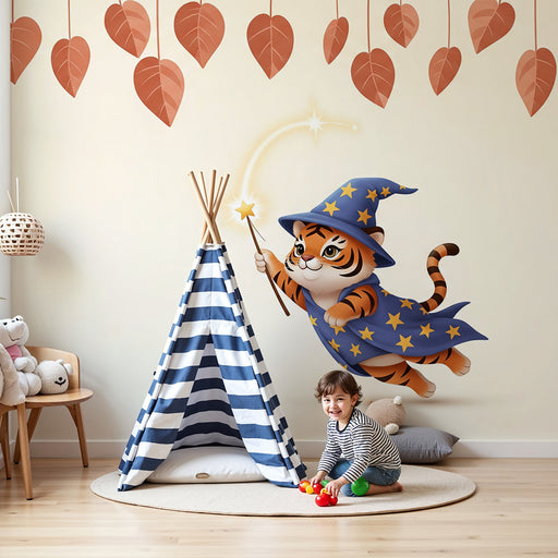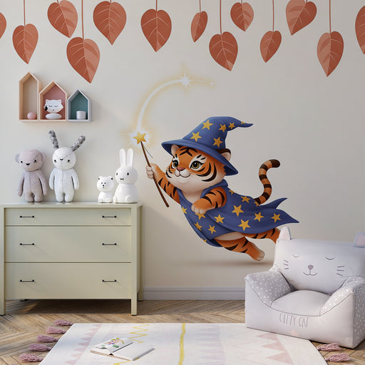 Vis alle detaljerBørneværelse tapet | Magisk tiger i troldmandskostume med stjerner