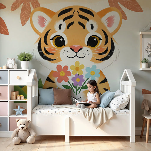 KidsWallForvandl dit barns værelse til en fortryllende verden med denne børneværelse tapet, der illustrerer en sød lille tiger, der sidder under et blomstr...