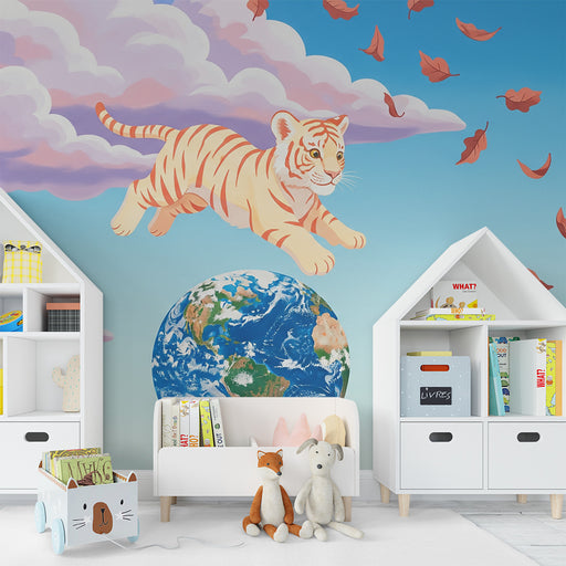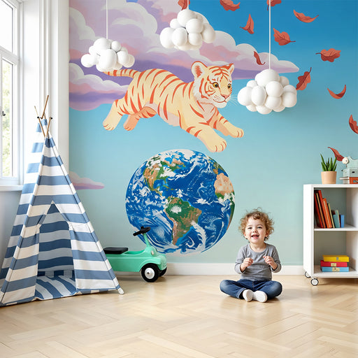 Vis alle detaljerBørneværelse tapet | Sød tiger i skyerne med jorden i baggrunden
