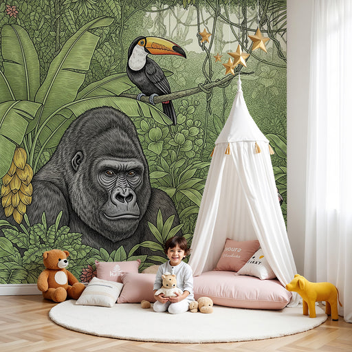 KidsWallRedesign dit barns værelse til en sand jungleoplevelse med denne børneværelse tapet. En imponerende gorilla står i forgrunden omgivet af tæt og liv...