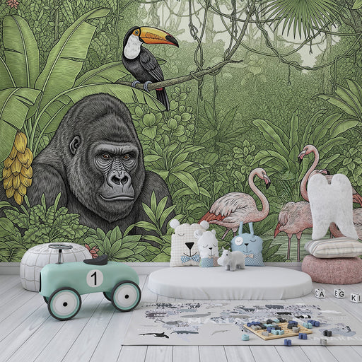 Vis alle detaljerBørneværelse tapet | Majestætisk gorilla og flamingoer i en frodig jungle