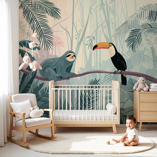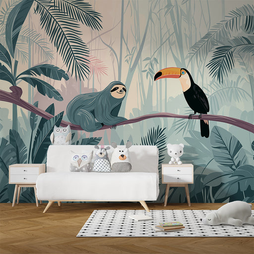 KidsWallTransformér dit barns værelse til et sandt naturhjørne med denne børneværelse tapet, der illustrerer en dovendyr og en tukan sidder på en gren. I e...