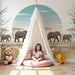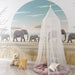Tag med på et vildt eventyr med denne børneværelse tapet, der viser en majestætisk flok elefanter, der går gennem savannen. Dekorationen fremkalder Afrikas naturlige skønhed, hvor elefanter bevæger sig fredeligt under en pastelfarvet himmel, oplyst af den blide solnedgang.